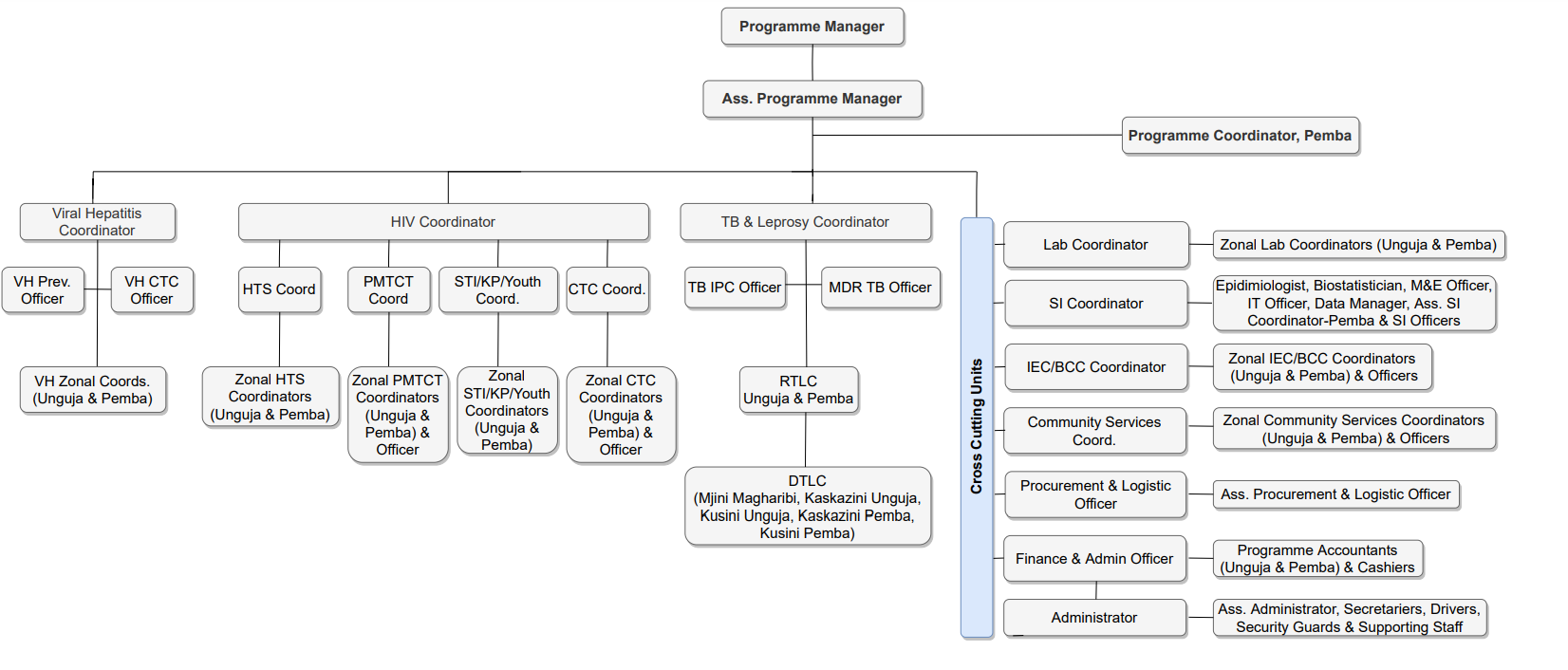 Current program units are: HIV Counseling and Testing, Prevention of Mother to Child Transmission of HIV, Care and Treatment, TB and Leprosy, Faith Based Leaders, IEC/BCC and other Prevention, Key Populations & Sexually Transmitted Infections, Home Based Care, HIV Laboratory, Strategic Information and Program Administration and Finance. The following below is the Organizational Chart of the program:-